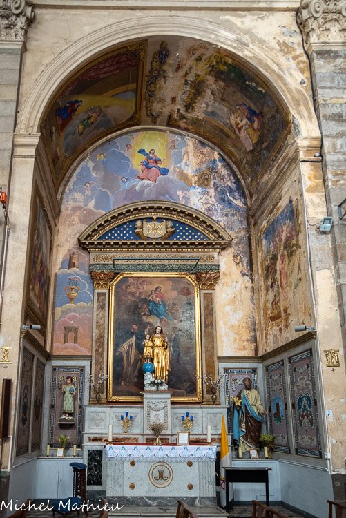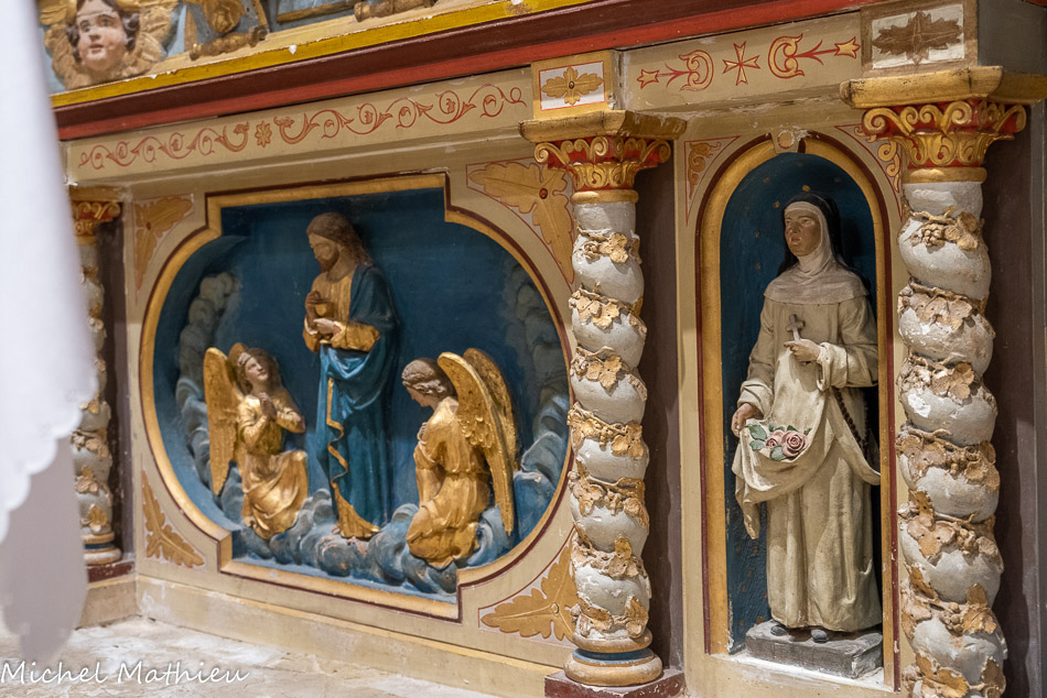 Retable de la Nativité. Bois polychrome et doré XVIIe s. Huile sur bois. 1541. Le retable lui-même, très caractéristique des retables du Haut-Var, dotés souvent de colonnes torses dotées, est remarquable pour le développement inédit de son couronnement, véritable composition autonome en miniature, multipliant les figures de soutènement et les décrochements. Remarquez également les ornements au sgraffito du gradin d’autel.