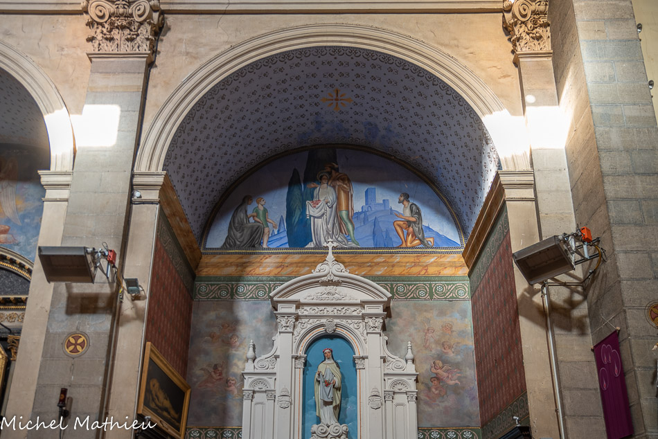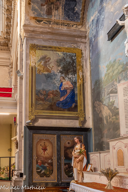 Chapelle de la Vierge. Donation du Rosaire à Sainte Catherine de Sienne et Saint Dominique. Statues de Jésus Enfant et de Saint Joseph.