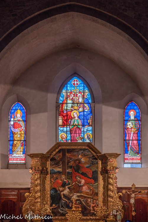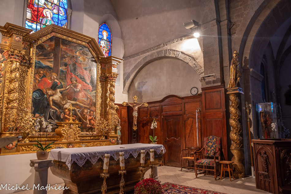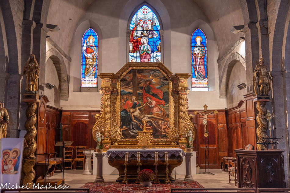 Le retable avec son maître-autel en bois sculpté, peint et doré a été réalisé en 1690 pour la chapelle Notre-Dame et transféré à l’emplacement actuel en 1989 (classé). Le tableau est de 1687 ; il a été peint par un certain J.L. Gasiaud ; il représente une descente de croix. Les boiseries datent des XVII et XVIII siècles. Elles ont été restaurées en 1996 par la Municipalité.