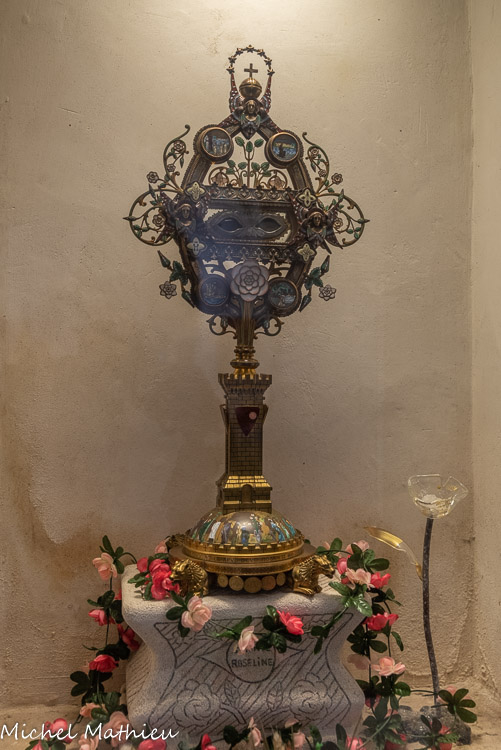 Reliquaire des yeux de sainte Roseline. Le cadre contenant les yeux est du 17e siècle. Le reliquaire date quant à lui de 1883. En 1660, Louis XIV souhaita vérifier la réalité du prodige de la conservation de ces yeux : il demanda son médecin du Vallot de crever l'œil gauche. La prunelle se troubla instantanément, les yeux étaient bien naturels.