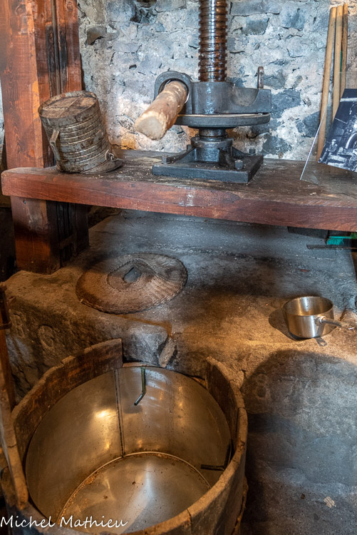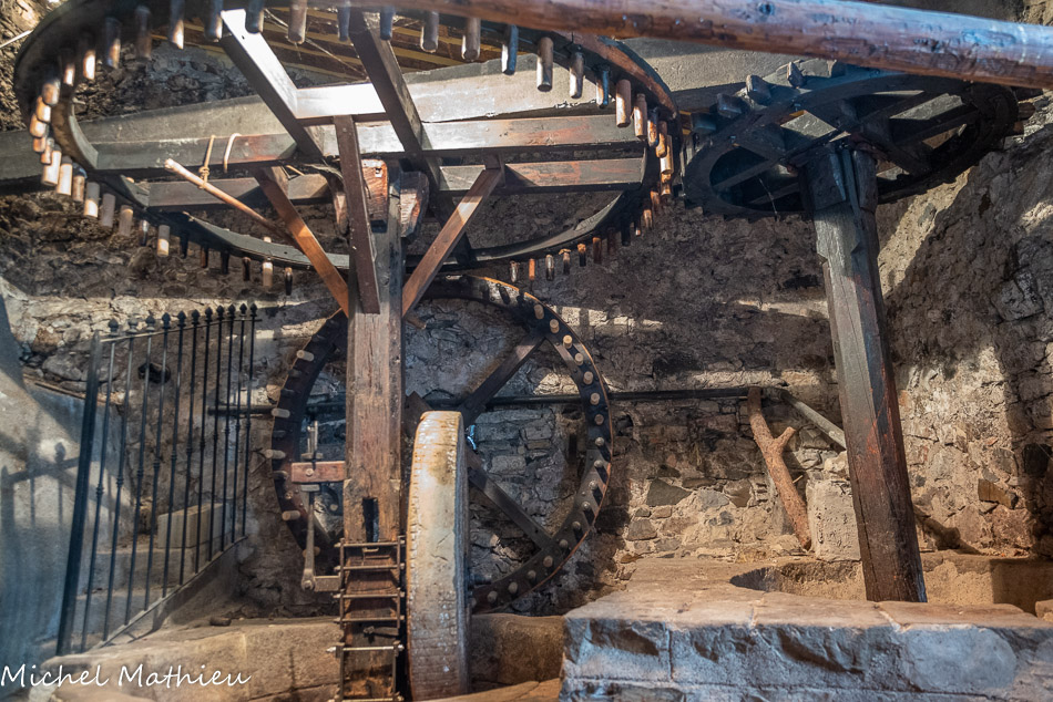 Le moulin à olives et son mécanisme. A droite, ce bassin circulaire, dans lequel tourne un axe équipé d’un peigne, s'appelle une laveuse. Le peigne triture le marc d’olives avec l’eau, ce mélange ira ensuite dans les enfers.