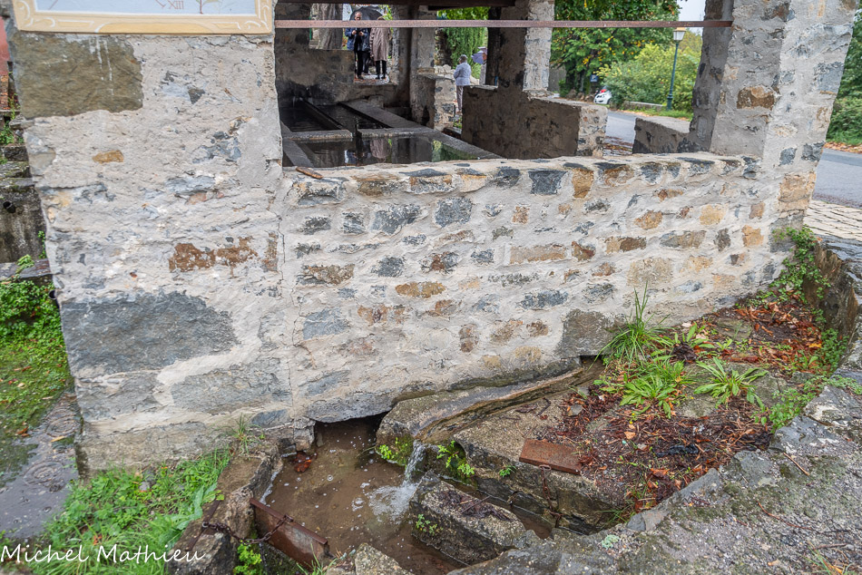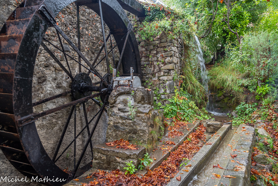 Le roue qui actionnait la meule du moulin à huile. Le lavoir reçoit une eau toujours propre grâce à une prise d’eau située en amont des moulins.