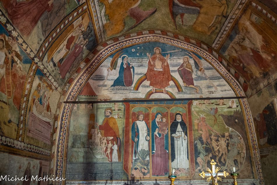 En haut, le Jugement Dernier. En bas, au centre, le triptyque des titulaires encadré par deux scènes du Jugement Dernier. Au centre, la Vierge Marie portant l'Enfant Jésus, qui joue avec un moulinet. A gauche, Saint Bernard de Menthon (+1081), protecteur des voyageurs à travers les Alpes. De sa main droite, li tient une croix de Lorraine, de la gauche, avec une corde de paille tressée, il tient en laisse le « démon des Alpes ». A droite, Sainte Brigitte de Suède (1302-1373): elle tient ouvert le livre de ses révélations et foule à ses pieds un dragon.