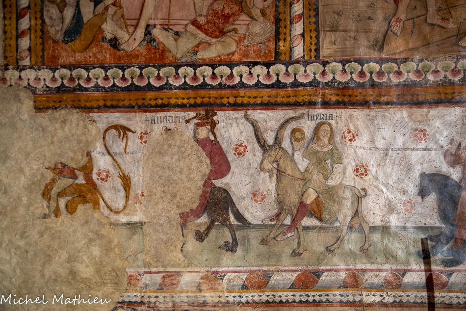 Les Vices, sur le mur à droite « Superbia », Orgueil, sur un lion (on ne voit que la queue), « Avaritia », Avarice, « Luxuria », Luxure, sur un bouc,