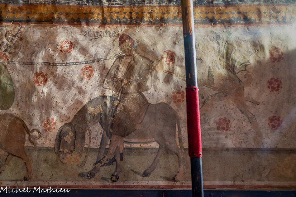 La deuxième travée est un ajout tardif du XVIIe s. avec décor floral malhabile du XIXe siècle.