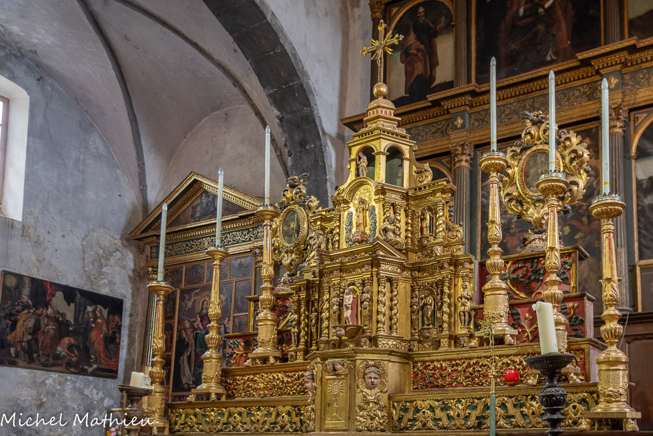 Le maître-autel. C'est un merveilleux ouvrage en bois sculpté de la fin du XVIIe siècle. Il comporte des degrés polychromes or et rouges complétés par un tabernacle pyramidal à trois étages, à colonnes torses décorées de volutes, de termes et de cariatides et de têtes de séraphins, complété de niches abritant des statues de prophètes. De part et d'autre sont disposés des reliquaires en forme de médaillons enguirlandés de feuilles d'acanthe. A l'intérieur de la monstrance, sous verre, nom des reliques ? Ce type de reliquaires très ornementaux était réservé aux grandes célébrations liturgiques. 19e siècle.