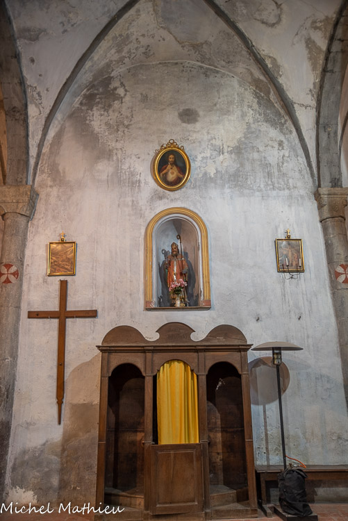 Paire de confessionnaux. 1845. Grand meuble composé de 3 niches, avec frontons en arc de cercle, il abrite la banquette du confesseur au centre et 2 agenouilloirs de part et d'autre. Bois taillé mouluré par endroits sommairement, un rideau en étoffe est tendu sur le portillon de la niche centrale. Deux estampes sont fixées dans les niches latérales comme aide à la méditation et à la pénitence. A gauche, statue de sainte Rita. Au centre, celle de saint Joseph, avec au-dessus un médaillon avec le Sacré-Coeur de Marie.