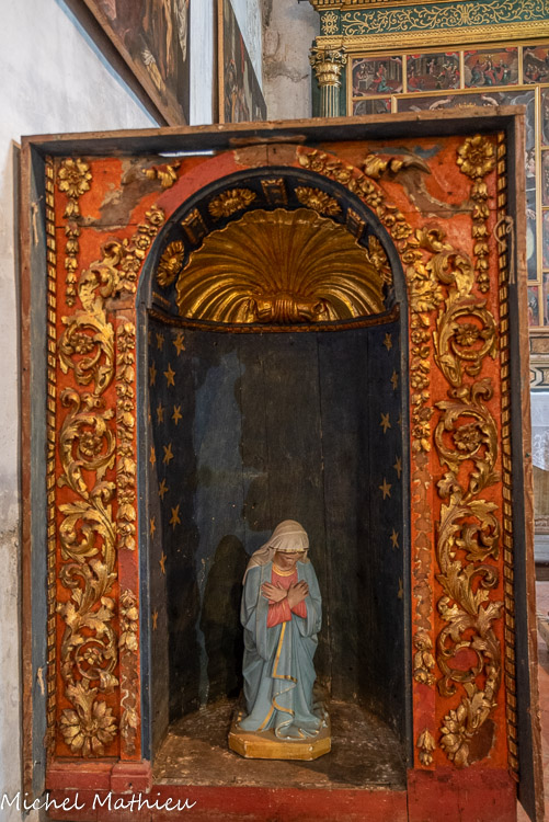 Niche centrale d'un retable (déposée). En haut, disposés symétriquement de part et d'autre de l'arc surmontant la niche se trouvaient deux angelots en vol. Ils ont été volés en 2002. Bois taillé éléments du décor sculptés et dorés sur fond rouge, et une coquille sur sa voûte. Statue de la Vierge Immaculée en plâtre polychrome et doré, tunique rose pale, voile et manteau bleu, semis de fleurs dorées