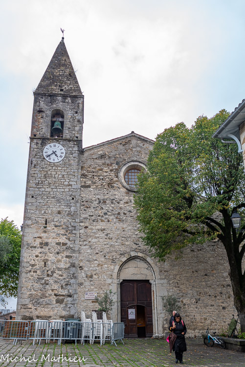 Elle fut construite entre 1200 et 1250 par les moines Chalaisiens. C'est un magnifique exemple d'architecture romane de type cistercien : aucune décoration, pureté des lignes, harmonie des volumes. Elle fut reconstruite entre 1480 et 1530. Le portail, avec ses colonnettes et chapiteaux monolithiques, est nettement postérieur, et le clocher de type « roman-lombard a été ajouté avec son horloge en 1854. L'église est une des seules de la région à ne pas avoir été transformée à l'époque baroque, elle est romano-gothique.