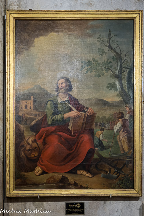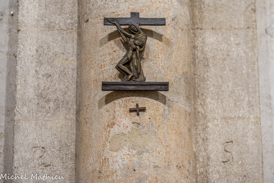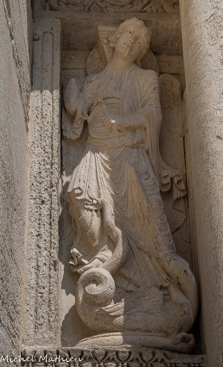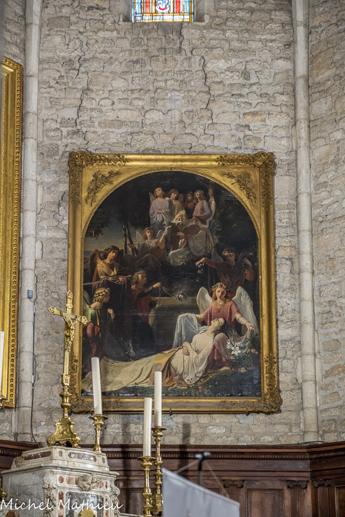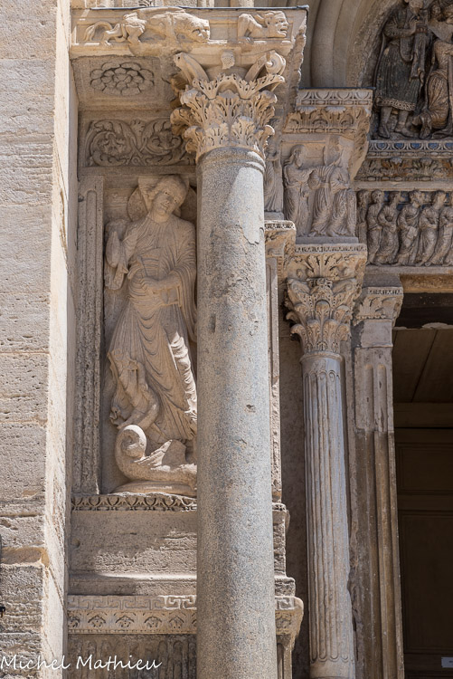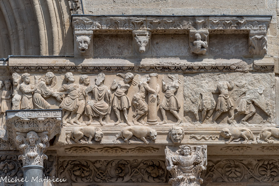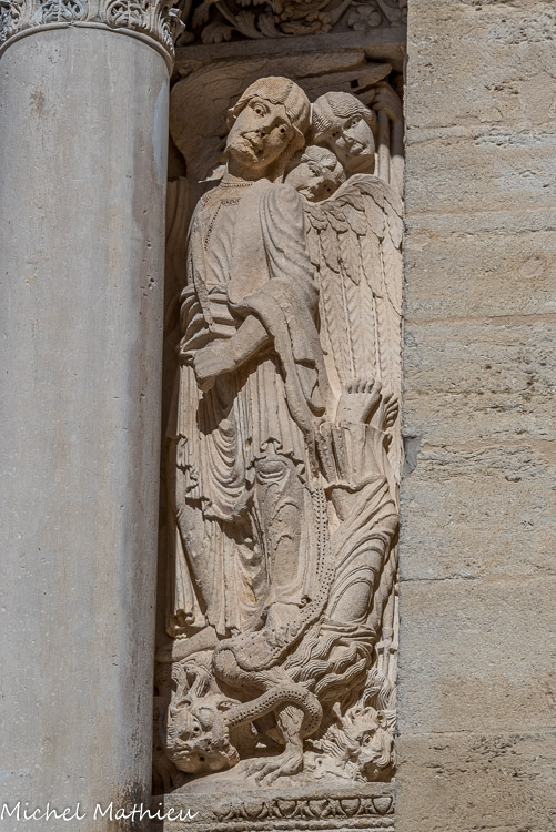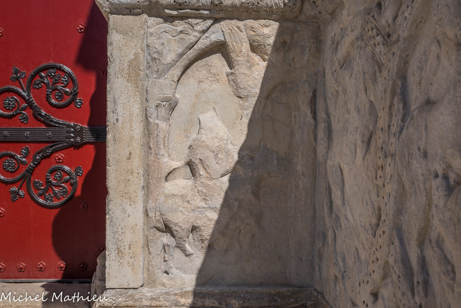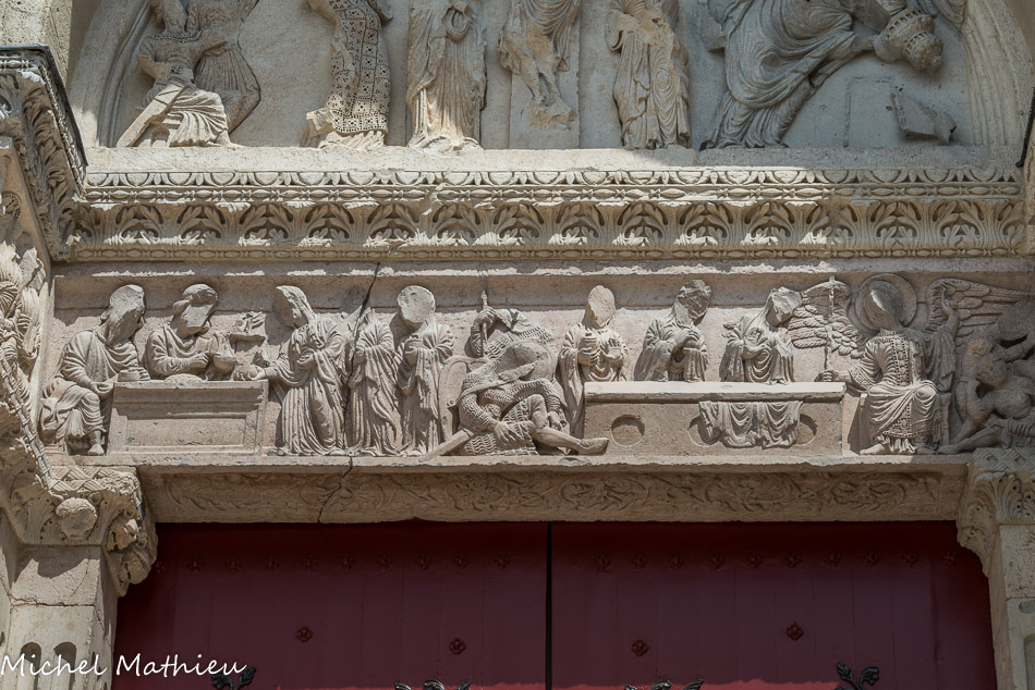 Saint Michel terrassant le dragon. L'artiste qui exécuta cette représentation est aussi celui qui a fait la plus grande partie de la frise. On remarquera les savants drapés de la tunique de Saint-Michel, son mouvement est l'expression du visage.