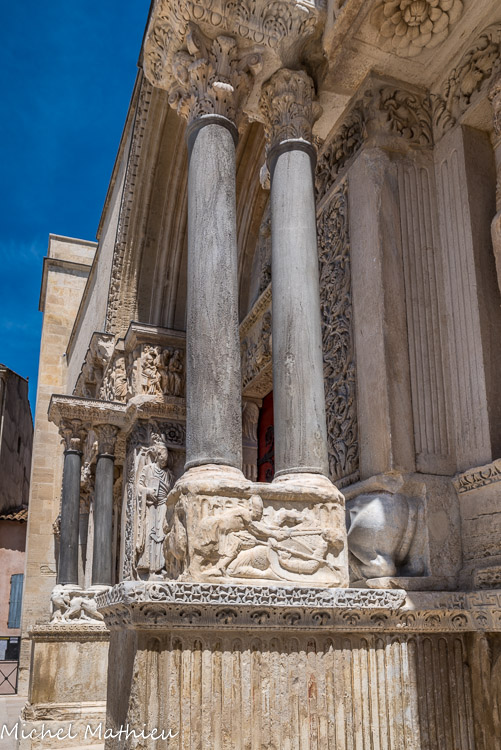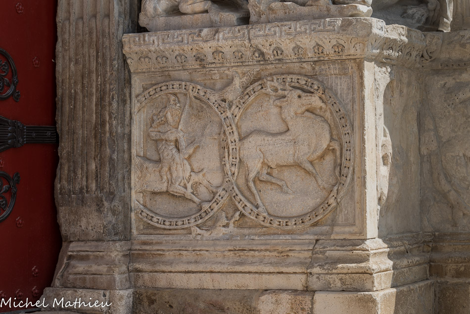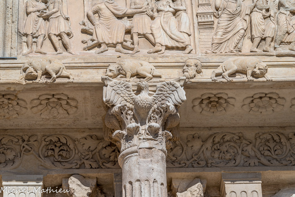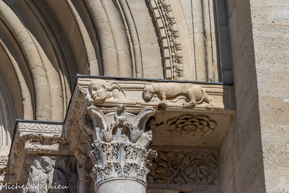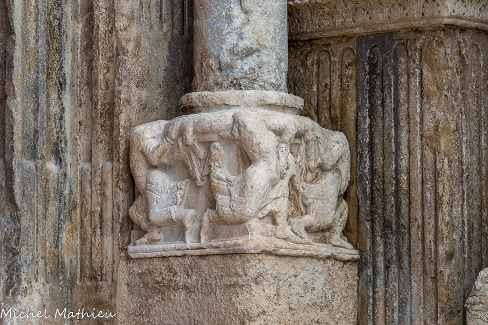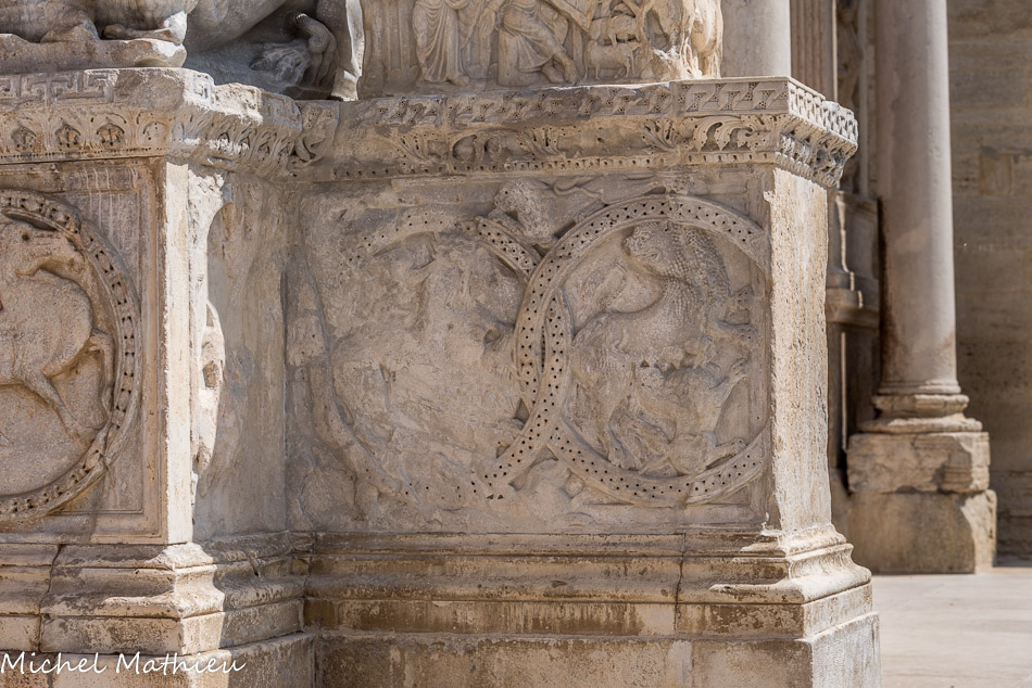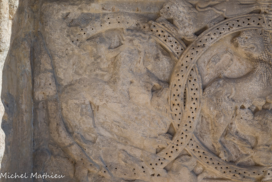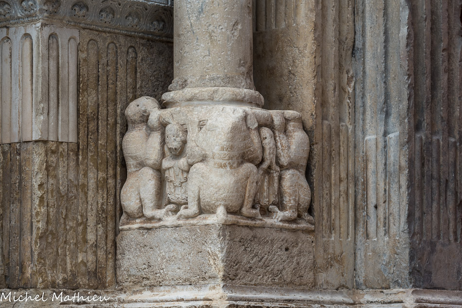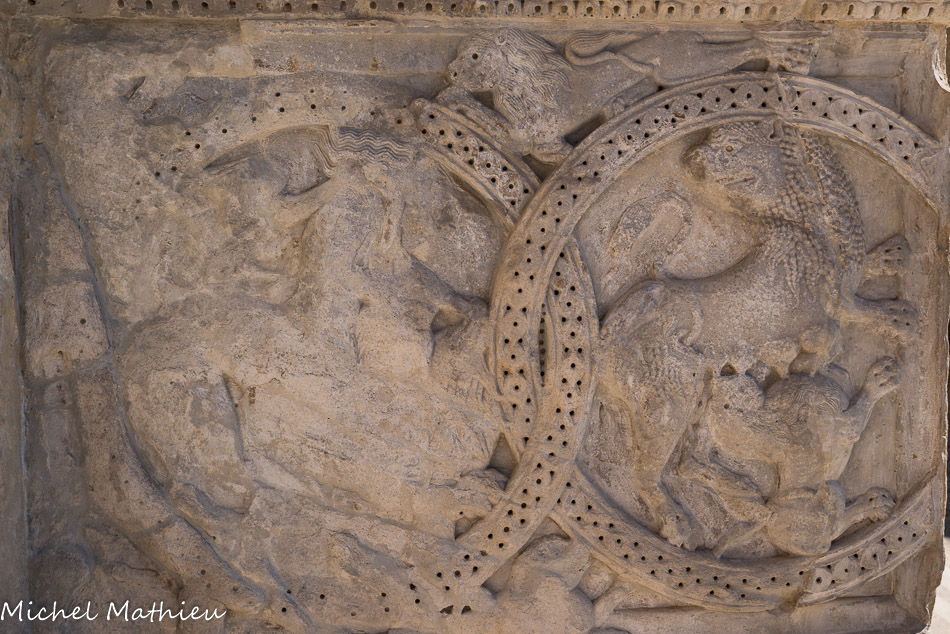 Sous les colonnes, singes, chameaux, chasse aux lions. Si le singe est l'image du diable, le chameau et le lion peuvent avoir une connotation positive ou négative.