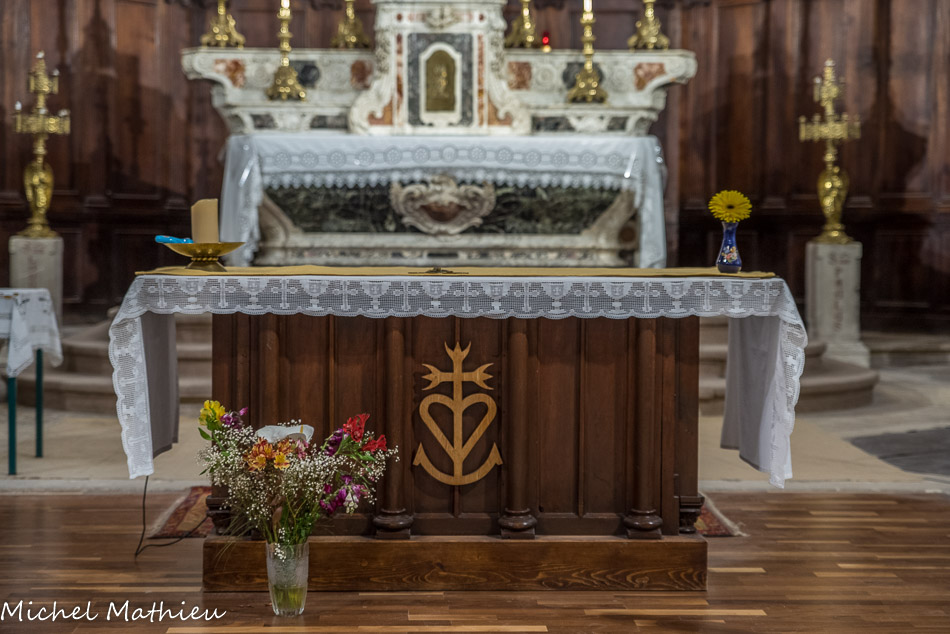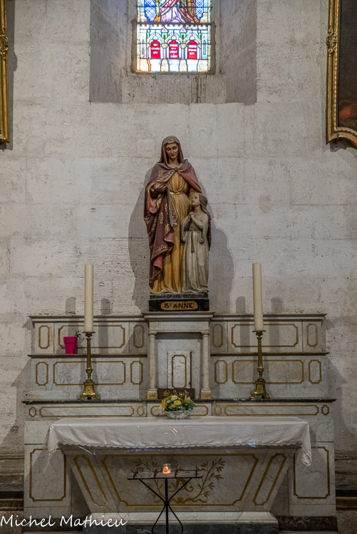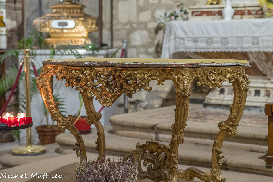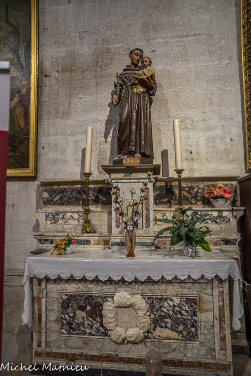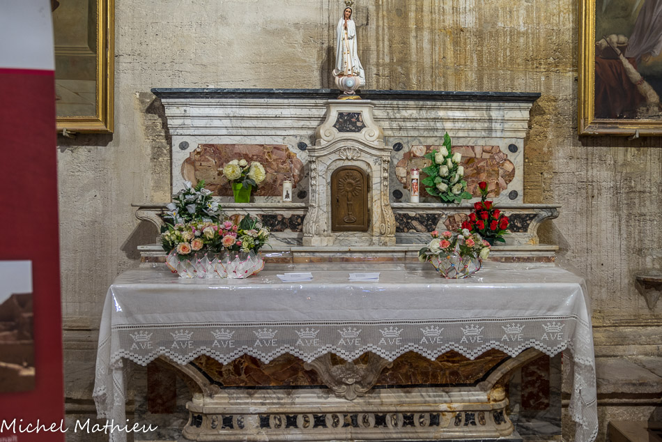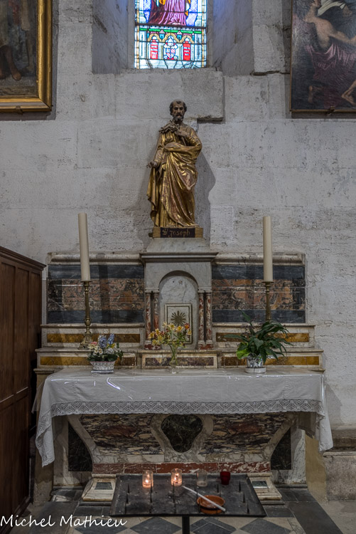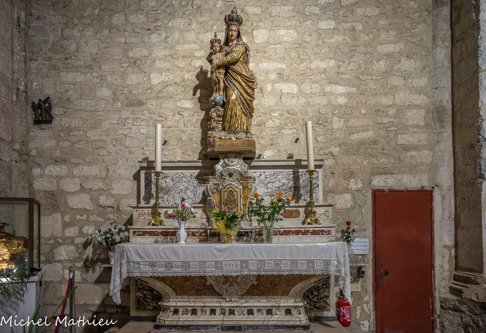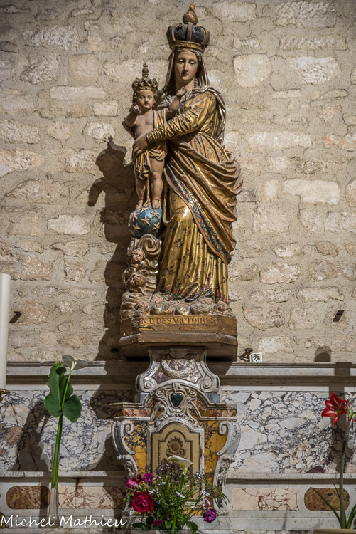 Chapelle de la vierge, avec la statue de Notre-Dame-des-Victoires en bois doré du XVIIIe siècle. Autel en marbre du VIIIe siècle