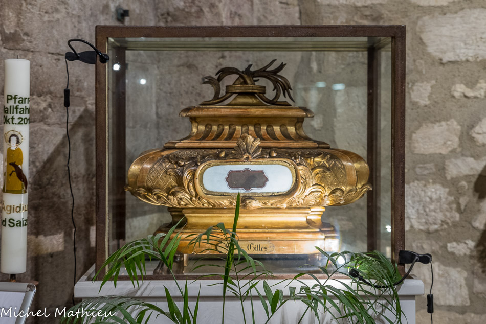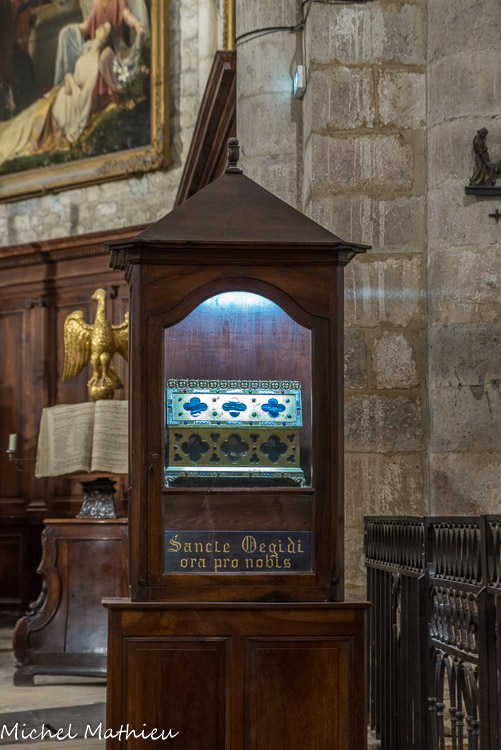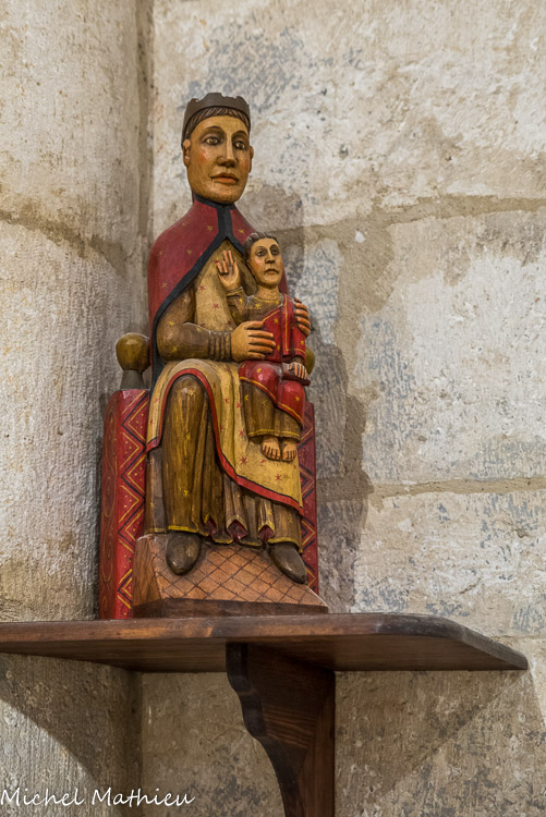 Notre-Dame de Nuria, mère de Dieu. Vierge à l'Enfant Catalane, sculptée, d'après la tradition immémoriale, par Saint Gilles lui-même pour la vénération des bergers. Copie à l'identique en bois, offerte à l'abbatiale de Saint-Gilles le 8 mai 2003. La Vierge tient l'enfant Jésus sur son genou gauche. Celui-ci a une de ses mains levée en signe de bénédiction.