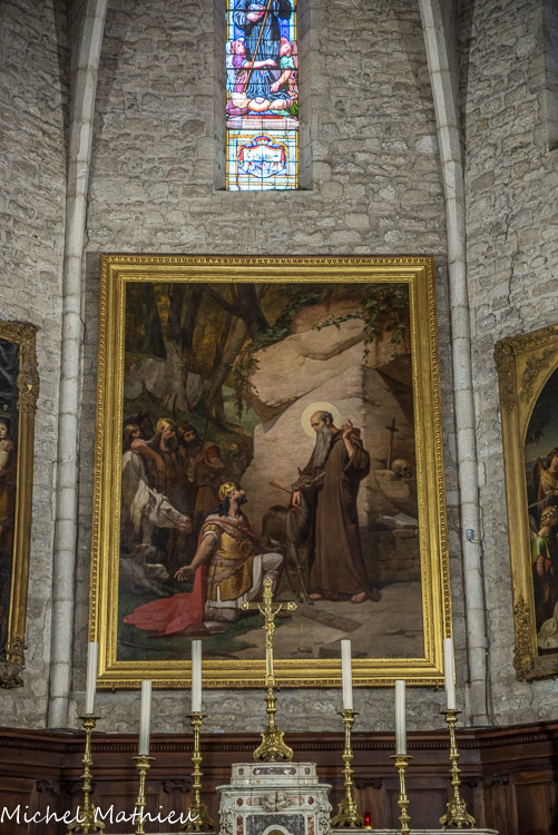 Le choeur. Saint Gilles, blessé à la main par une flèche, la biche qui est venue se réfugier auprès de lui et le roi Flavius (ou Wamba).