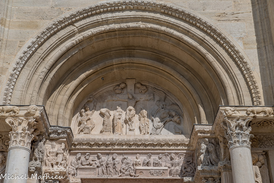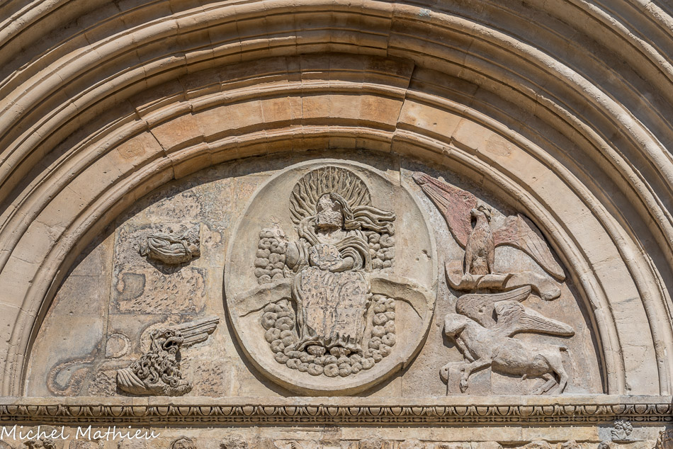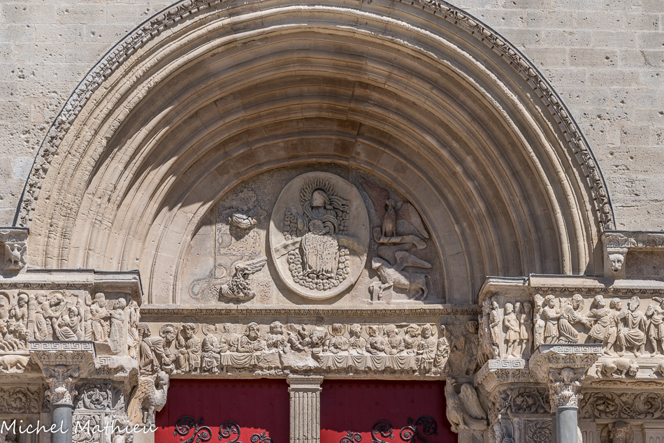 Tympan central (refait au XVIIème siècle) : Le Christ de Majesté entouré des quatre Vivants de l'Apocalypse, le « Tétramorphe », symbole des quatre évangélistes : l'homme de Mathieu, l'aigle de Jean, le lion de Marc et le taureau de Luc.