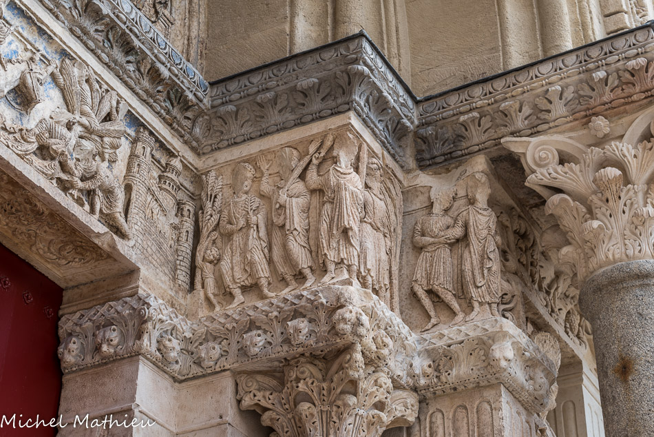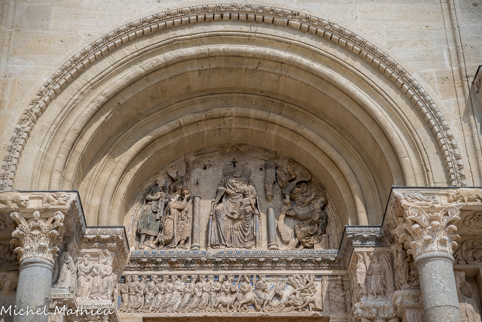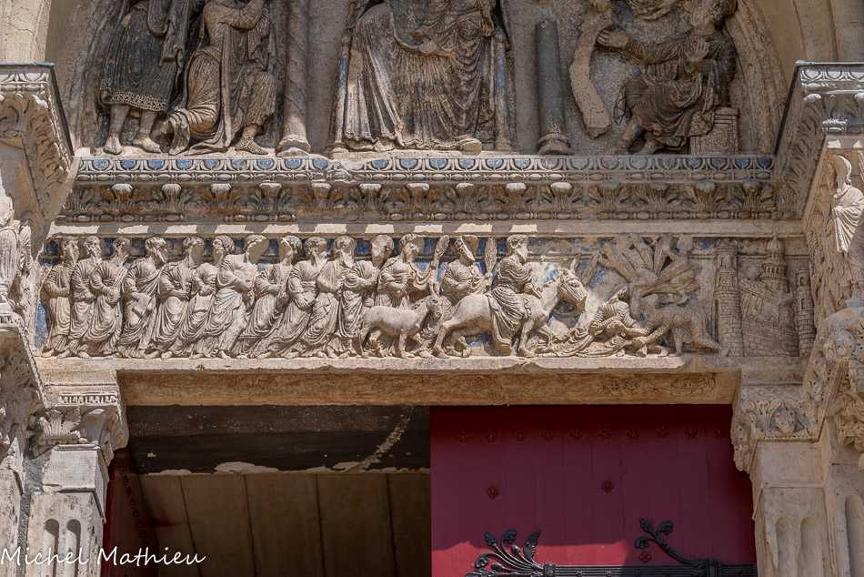 Tympan nord : à gauche, Adoration des mages, au centre, Vierge en Majesté,à droite, songe de Joseph : cycle de l'Incarnation de Dieu. La frise : Les préparatifs de l'entrée à Jérusalem ; Le cortège des apôtres ; Jésus entrant à Jérusalem ; Les habitants de Jérusalem accueillant Jésus.