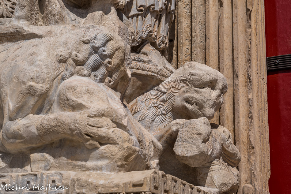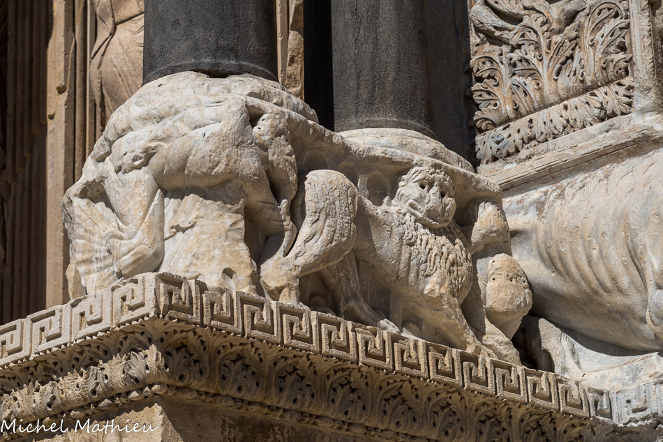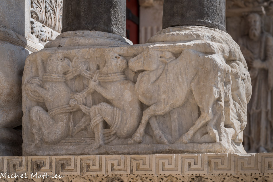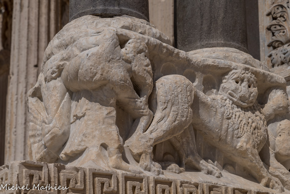 Servant de socle aux grandes statues d'apôtres, taillés dans le marbre, des fauves déchirent un homme et un bélier.