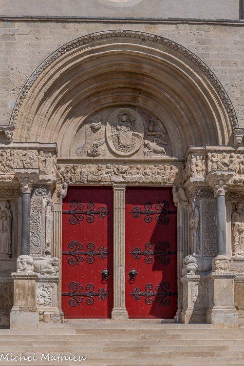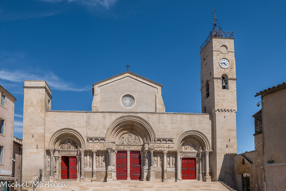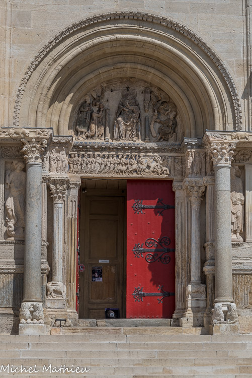 L'église haute actuelle n'occupe que le volume de la nef de jadis, le reste ayant été détruit par les protestants qui épargnèrent la façade. Cette dernière est constituée de trois portails séparés par des colonnes et entièrement décorée. Elle présente une parenté évidente avec les arcs de triomphe construit par les Romains, notamment à Orange.