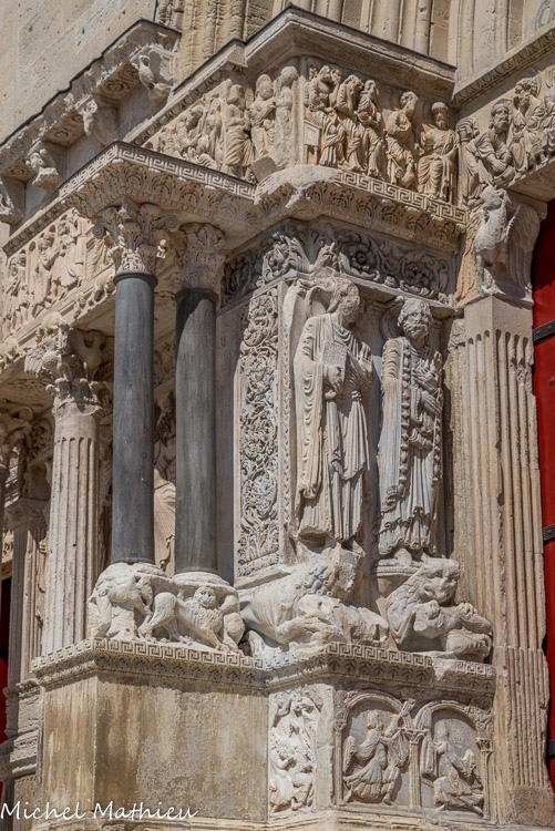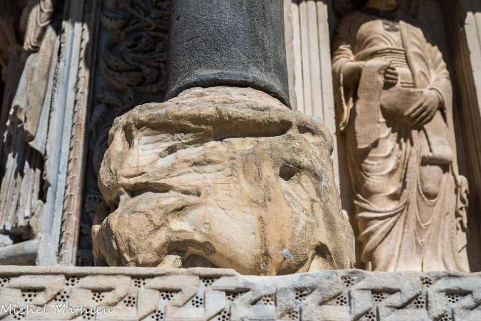 Saint Jacques le Majeur et Saint Paul. Sculpteur : Brunus. Servant de socle aux grandes statues d'apôtres, taillés dans le marbre, des fauves déchirent un homme et un bélier.