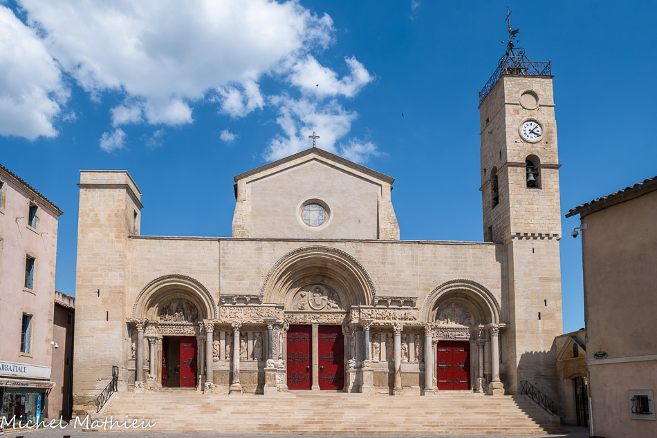 Long de 95 mètres, large de 33 mètres à la façade et de 40 mètres au transept ouvert sur un chœur à déambulatoire, cet édifice est bâti au-dessus d'une vaste église inférieure selon un plan architectural rare dans la région et a la dimension des grandes églises de pèlerinage. Au XVIème siècle, les violents conflits des guerres de religion vont considérablement l'endommager. Cette façade a été élevée en plusieurs étapes et plusieurs sculpteurs y travaillèrent, dont le fameux Brunus qui signa les statues de Saint Mathieu et de Saint Barthélémy.