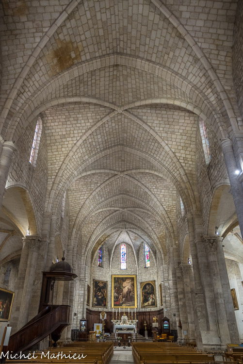 Longue de 50m, sa nef centrale élevée à 16m est flanquée d'un chevet polygonal. L'édifice est soutenu par des voûtes sur croisée d'ogives, largement rabaissées (18m au lieu de 25m pour la nef centrale).